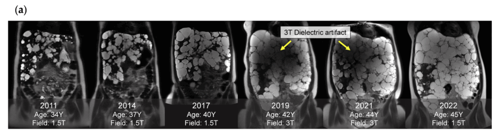 この画像は、多発嚢胞腎の腹部T2WI上の経過です。
