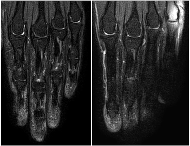 装置はフィリップス Ingenia CX 3.0T、コイルはSmall Extremity coil(8ch)を使用しました。撮像シーケンスはFS T2WI(SPIR)です。