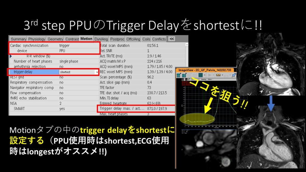 PPU使用時はMotionタブの中のtrigger delayをshortestに設定します。Fig.3では胸部大動脈レベルでのQ-FLOWを撮像していますが、ほぼ全例 shortest設定にするだけで大丈夫です。ECG設定でも綺麗に取れるのですが、PPUの方が簡便で画質も問題無いのでオススメです(胸部領域でも呼吸同期は必要ありません)。