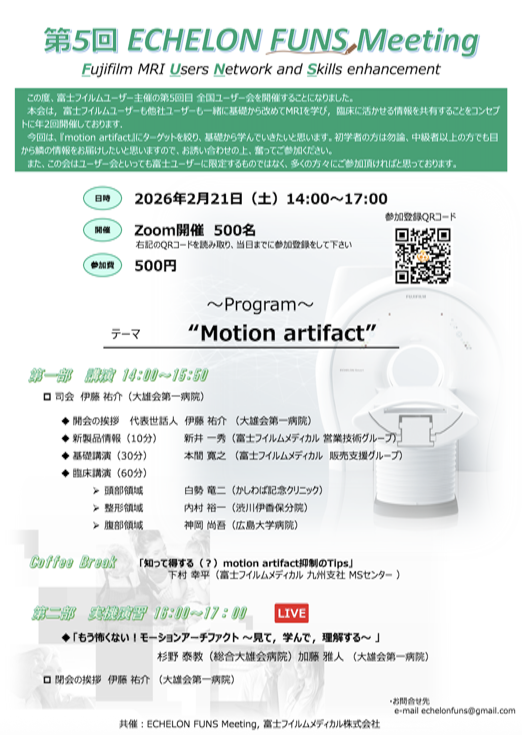 動きに泣かされてきた皆さんへ.モーションアーチファクトの正体を,MRI装置を実際に操作しながら“その場で”暴く実機演習セッション.見て・学んで・理解して明日からの臨床がちょっと楽になる内容を用意しています.ぜひ気軽にご参加いただき,実践に役立つ知見を持ち帰ってください.