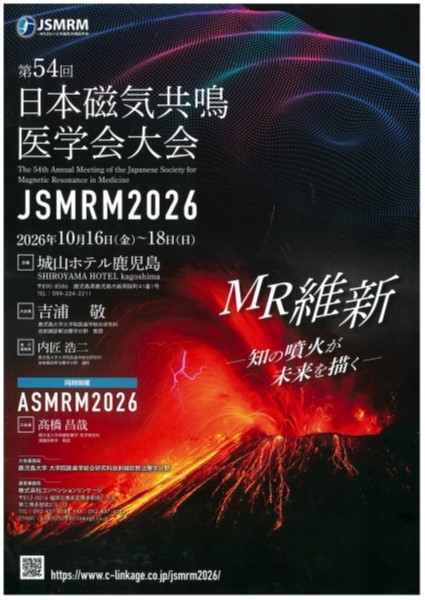 来年10月16~18日に鹿児島で第54回磁気共鳴医学大会が開催されます。ぜひとも学会にご参加していただき、鹿児島の美味しい黒毛和牛や黒豚、鶏刺しといった郷土の料理を楽しんでいただけたらと思っております。マグマのように熱い鹿児島の地で皆様とお会いできること、そしてたくさんの方々のご参加を心よりお待ちしております!!