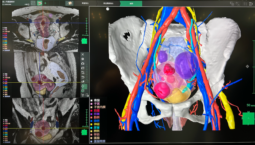 Iso voxelの3D-T2WIのみで,子宮や卵巣などの婦人科臓器だけでなく,動静脈や膀胱,尿管なども自動で抽出できる機能です.子宮筋腫などは腫瘍内に様々な成分が混在するっことがありますが,腫瘍部分だけを他組織とは分けて表示することも可能だそうです(腫瘍の抽出はマニュアルのようです).T2WIだけで術前画像が完成してしまうのは驚きでした.画像のMPRのように,腹壁の動きが入った画像でもここまでのVRが出せるのもすごいと思いました.